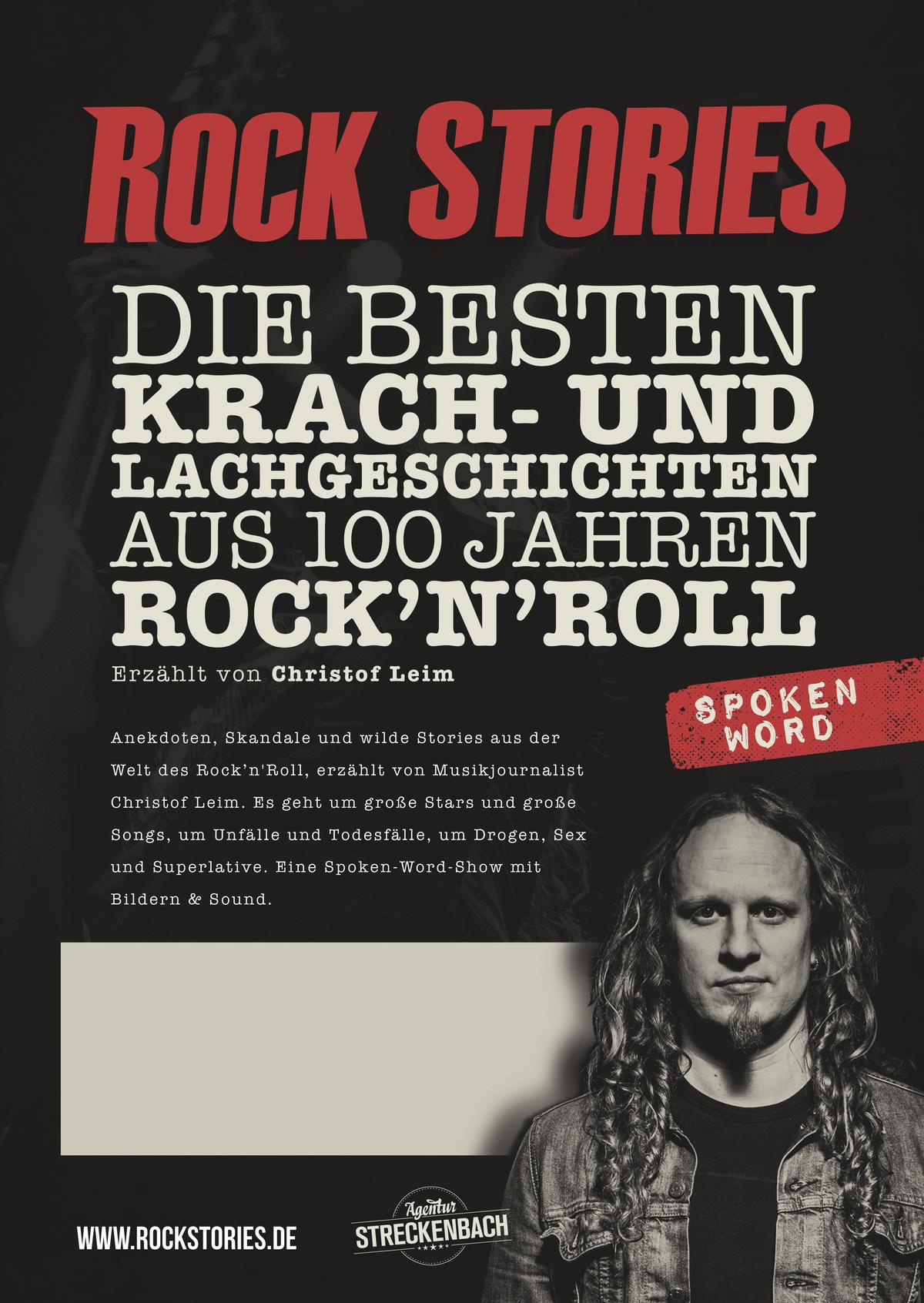 Anekdoten, Skandale und wilde Stories: Musikjournalist Christof Leim erzählt die besten Krach- und Lachgeschichten aus 100 Jahren Rock’n’Roll. Es geht um große Stars und große Songs, um Unfälle und Todesfälle, um Drogen, Sex und Superlative. Was haben AC/DC mit einem Serienkiller zu tun? Was macht Alice Cooper bei der Muppet- Show? Und welche Dame konnte in den Sixties drei der größten Gitarristen der Welt gleichzeitig den Kopf verdrehen? Die Musikhistorie steckt voll solcher Sonderbarkeiten: So schlagen sich Mötley Crüe mit einem traurigen Doppelgänger rum, Anthrax besuchen Al Bundy, und Ozzy Osbourne dreht sowieso meistens durch. Oder die Nacht, in der The Who-Drummer Keith Moon versehentlich seinen Chauffeur überfährt... Der Zuhörer erfährt Skurriles und Hintergründiges, Abgefahrenes und Überraschendes, fachkundig erklärt und vorgetragen mit Musik. Die Rock Stories gastierten schon auf der Full Metal Cruise, dem Rock Hard Festival und den Hamburg Metal Dayz sowie Clubs & Kneipen in ganz Deutschland. Man darf sich eine Rock Stories-Show vorstellen wie ein Tresengespräch unter Musikfreaks, bei dem einer vorne sitzt und begleitet von Bildchen, Songs und Videos Geschichten erzählt oder vorliest, über die wir uns beim Bierchen sowieso unterhalten würden. Christof Leim arbeitet seit über 20 Jahren als Journalist und Musiker. Er kam fast gleichzeitig mit dem Kiss-Debüt auf die Welt und erhielt seine erste Gitarre, als Zakk Wylde gerade bei Ozzy einstieg. Später war er Chefredakteur des Metal Hammer und schreibt heute für verschiedene Musikmedien. Von ihm stammt die tägliche Kolumne „Zeitsprung“ mit Musikgeschichten auf uDiscover. Er spielt Gitarre für die Bands The New Black und Heavysaurus.
