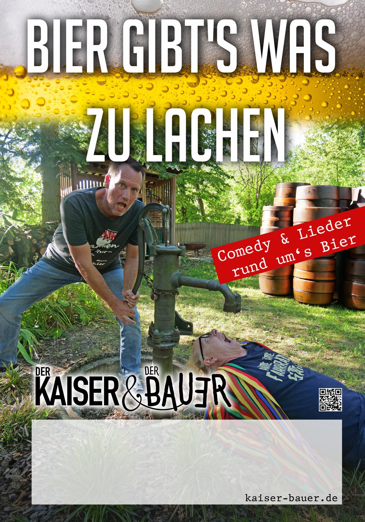 Mit ihrem neuen Comedy-Programm „Bier gibt‘s was zu lachen“ präsentieren „Der Kaiser und der Bauer“ eine abwechslungsreich-witzige Liebeserklärung an das fränkische Bier und die damit verbundende Lebensart. Oder wie die beiden sagen: „Im Wein liegt Wahrheit, im Bier liegt Kraft und im Wasser – nur die Verdünnung.“ Wer sich feinste Gerstensaftgeschichten und launige Lagerbier-Lieder einschenken lassen will, der ist bei „Bier gibt‘s was zu lachen“ von „Der Kaiser und der Bauer“ goldrichtig, denn in dieser Comedy-Show entfaltet sich garantiert ein reichhaltiges Unterhaltungs-Aroma von Malz und Hopfen, das durch eine langanhaltende kräftige Witz-Würze abgerundet wird.